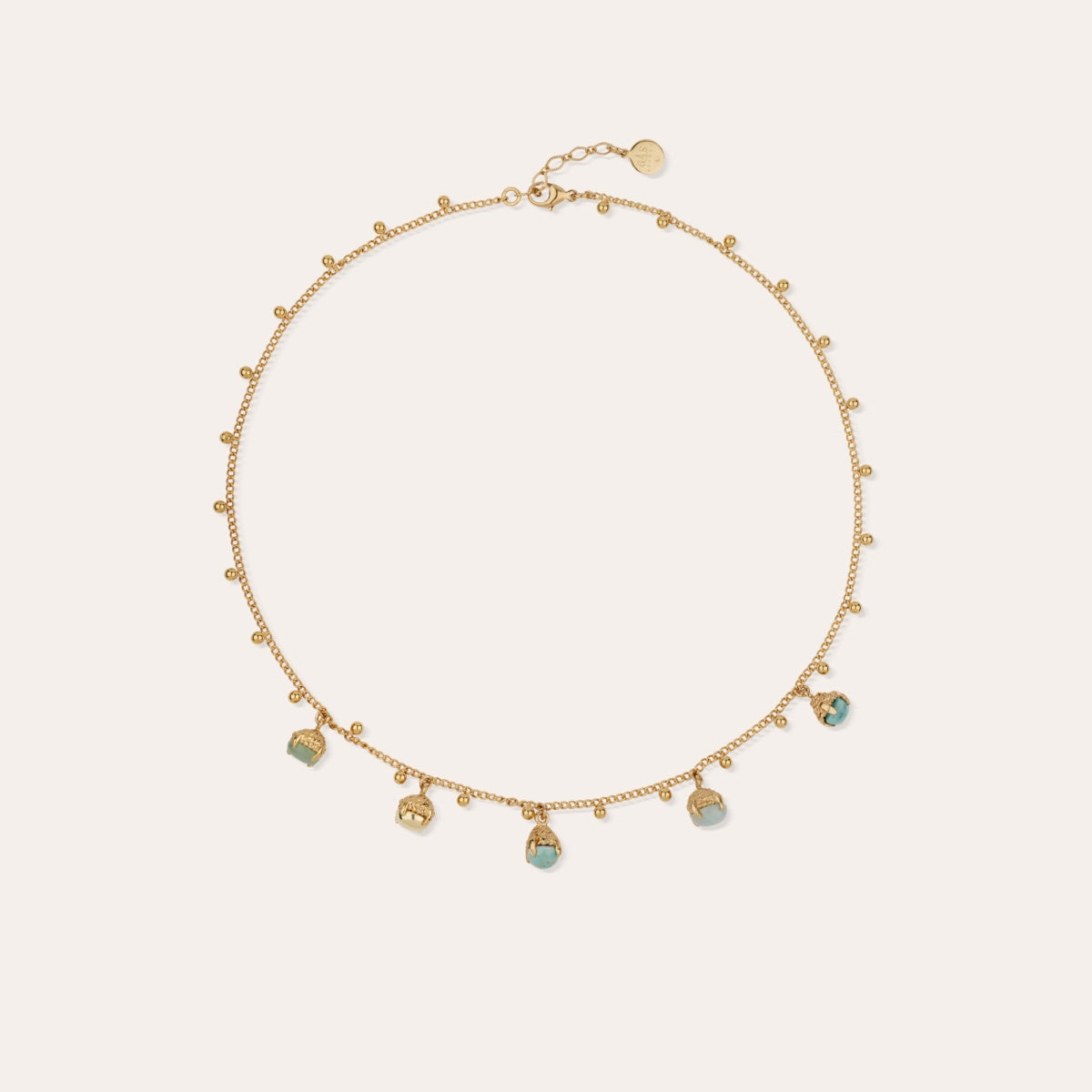 Necklace gold plated chain, dressed with colored glass stone pendants and golden beads