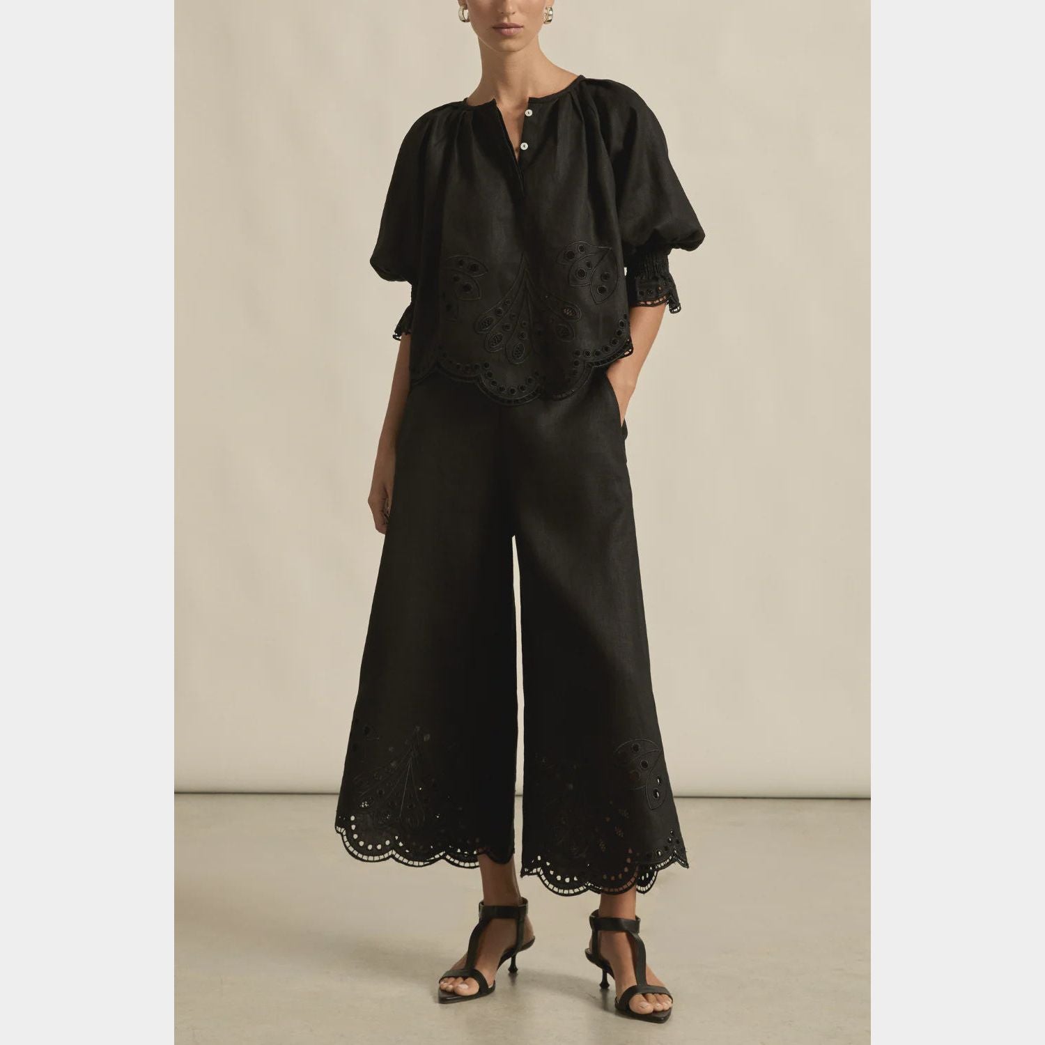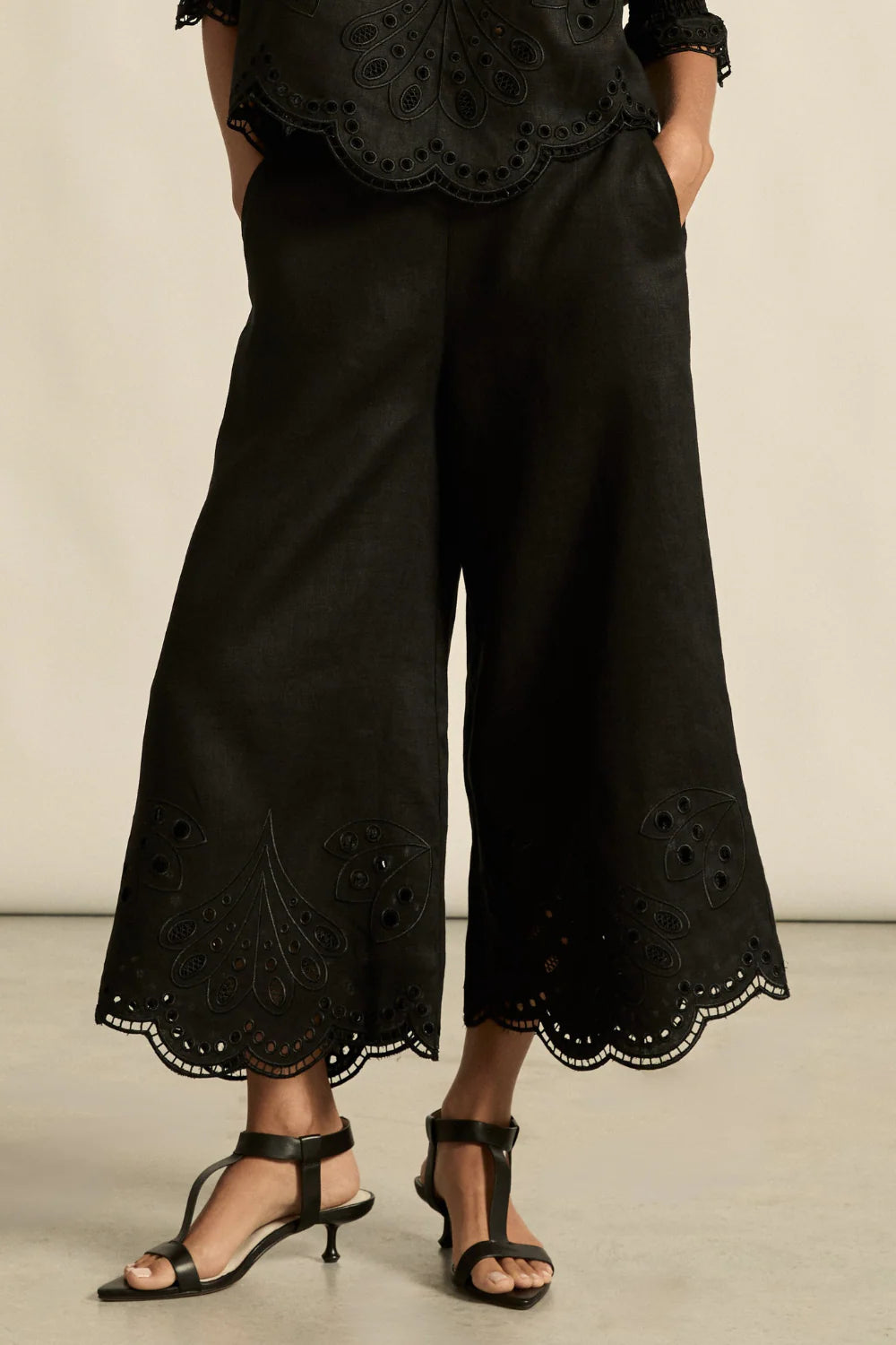 Cropped scalloped-edge black pants by Australian fashion label Zoe Kratzmann, the new Apprise Pants are a must-have for your Spring wardrobe. Made from a lightweight fabric and embroidered with a delicate floral motif and finished with a scalloped hem, the new apprise pant is an easy-to-wear pant with a relaxed holiday-vibe.
